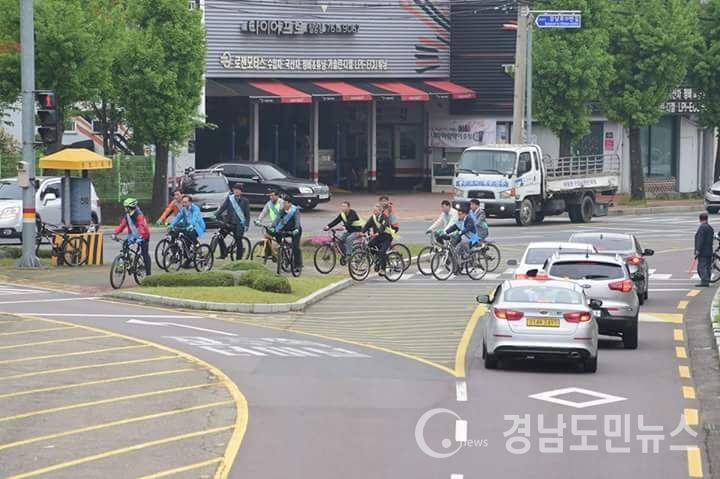진주시 공무원들이 지난 22일 진주시공직자 자전거 이용의날 ‘자전거 타기 캠페인’ 중 도로교통법 및 교통사고특례법에 따라 ‘차’로 규정된 자전거를 타고 횡단보도를 건넌 것이 확인돼 빈축을 사고 있다.