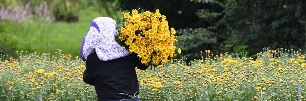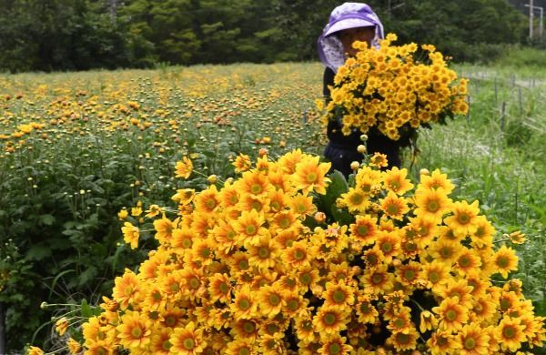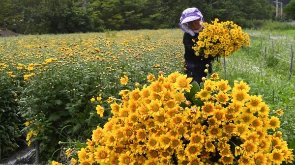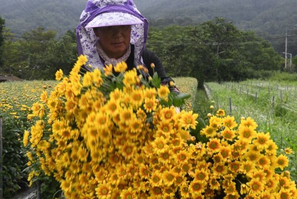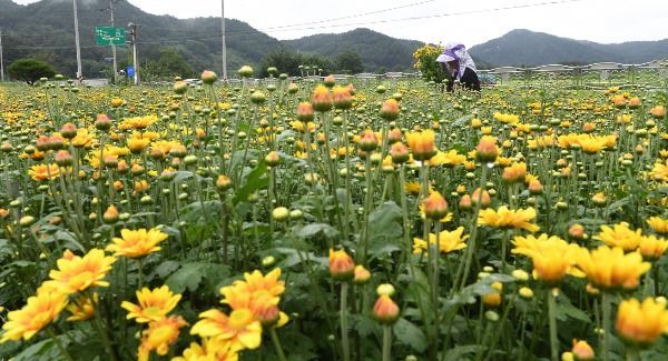 6월부터 시작된 긴 장마가 8월 중순까지 이어진 12일 경남 거창군 북상면 소정리의 한 국화(샤롯트) 재배지에서 한 농민이 모처럼 장마가 소강상태를 보이자 노랗게 꽃망울을 터트린 국화(샤롯트)꽃을 수확하고 있다.