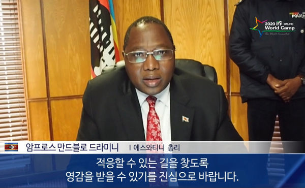 국제청소년연합(IYF)은 에스와티니(Kingdom of Eswatini)의 암브로스 드라미니(Ambrose Mandvulo Dlamini) 총리와 IYF 설립자 박옥수 목사가 화상회의 프로그램을 통해, 청소년 온라인 캠프의 성공적인 개최를 축하하고, 코로나19 이후 에스와티니 정부와 IYF의 지속적인 협력 방안을 논의했다고 밝혔다.