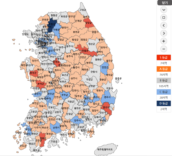 평가 결과에 따라 전체 226개 기초단체는 S등급 23개, A등급 67개, B등급 70개, C등급 45, D등급 21로 분류됐으며, 이 평가에서 진주시는 하위 30% 이하의 기초자치단체만 속한 C등급에 이름을 올렸다.