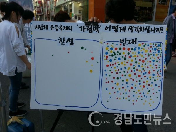 | 남강유등축제를 지키기 위한 진주시민행동이 진주 중앙시장 입구에서 '가림막'설치에 대해 진주시민을 대상으로 찬반을 묻고 있다./ 가림막 설치 반대에 다수의 시민들이 스티커를 붙여 놓았다. |