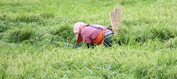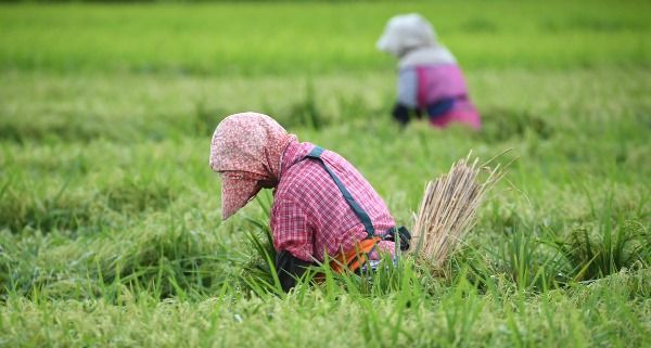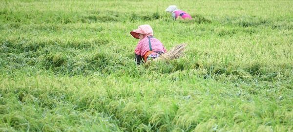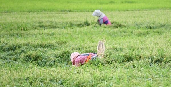 3일 경남 거창군 남상면 월평들에 태풍 ‘마이삭’이 밤새 할퀴고 간 들녘에서 농민들이 한 톨의 쌀을 더 건지기 위해 쓰러진 벼를 세워 묶고 있다.
