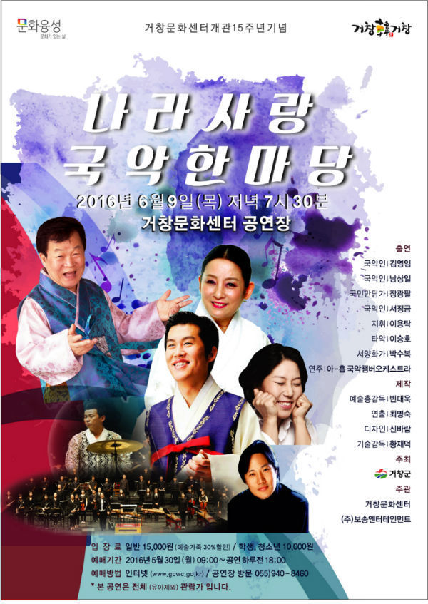 (거창=경남도민뉴스) 박현섭 기자 = 거창군 문화센터는 6월 호국보훈의 달을 맞이하여 국악의 의미를 되새기며 개관 15주년을 기념하기 위해 다음달 9일 ‘나라사랑 국악한마당’을 주제로 공연한다.