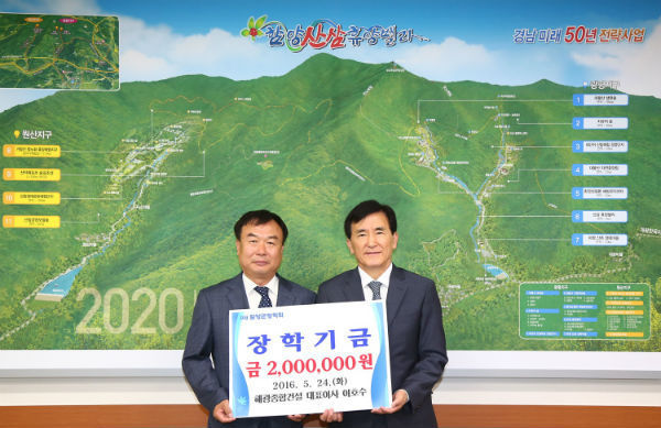 (함양=경남도민뉴스) 박현섭 기자 = 함양군(군수 임창호)에 따르면 24일 타지에서 경제활동을 하면서도 지속적으로 고향발전에 관심을 갖고 참여해온 함양출신 사업가 해광종합건설 이호수(61)대표이사가 군청을 방문, “훌륭한 후배들이 많이 배출되기를 바란다”며 (사)함양군장학회 임창호 이사장에 장학금 200만원을 기탁했다.