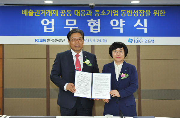 한국남동발전(사장 허 엽)은 지난 24일 서울 IBK기업은행 본점 대회의실에서 허엽 사장을 비롯한 IBK기업은행 권선주행장과 이업종협의회 권영민회장 등 양사 관계자들이 참석한 가운데 ‘배출권거래제 공동대응과 중소기업 동반성장을 위한 업무협약’을 체결했다.