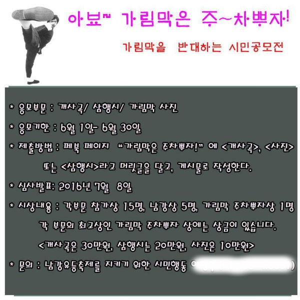 남강유등축제를 지키기위한 시민행동(대표 서원명, 이하 시민행동)이 지난 1일부터 '아뵤 ~ 가림막은 주차뿌자!'를 슬로건으로 걸고 '가림막을 반대하는 시민 공모전'을 열고 있다.