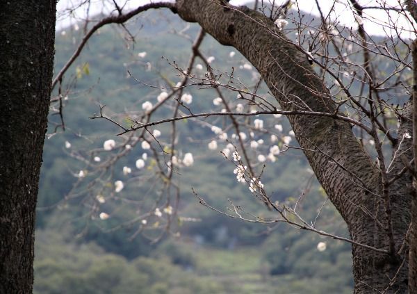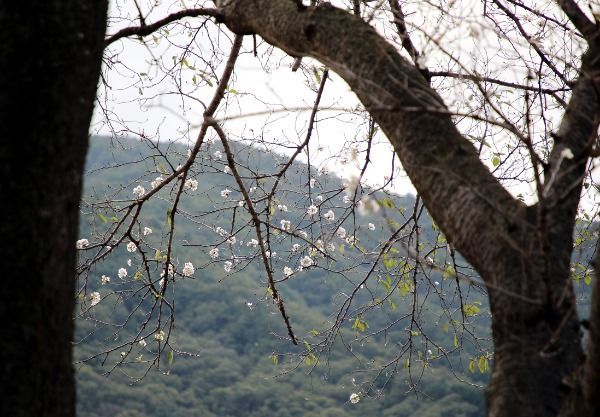 화개장터 십리벚꽃 길로 이어지는 하동군지리산생태과학관 앞 19번 국도변의 벚나무 한 그루에서 지난 25일 벚꽃 몇 송이가 분홍빛 속살을 드러냈다.