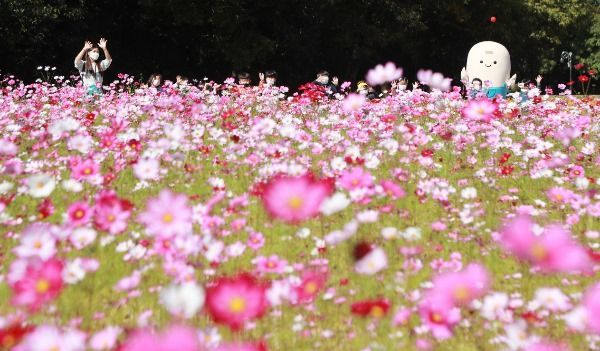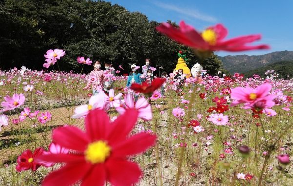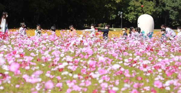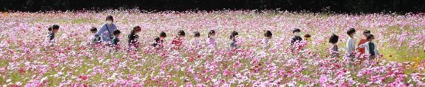 경남 함양군 상림공원을 찾은 어린이들이 활짝 핀 코스모스길을 걸으며 청명한 가을 날씨를 만끽하고 있다.