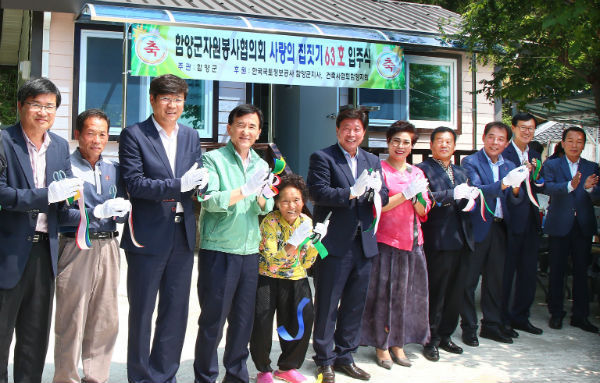 함양군 자원봉사협의회가 주관한 10일 입주식에 임창호 군수, 황태진 군의회 의장, 이재욱 마천면장, 정구상 함양군자원봉사센터장, 신오남 함양군자원봉사협의회장, 이인 마천면자원봉사협의회장, 내마마을 이장 및 주민 등 50여명이 참석해 어르신의 소중한 보금자리마련을 축하하고 ‘사랑의 집 63호 입주식’을 열고 새로운 거처를 얻게 된 곽봉선(82) 어르신에게 집 열쇠를 전달했다.