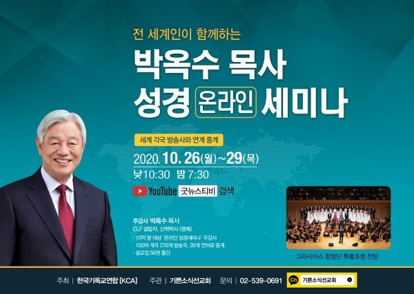 올해 5월 전 세계 10억 명의 사람들을 대상으로 예수그리스도의 복음과 믿음의 삶에 대한 설교와 간증으로 화제가 됐던 ‘박옥수 목사 온라인 성경세미나’(이하 성경세미나)가 오는 10월 26일(월)부터 29일(목)까지 4일간 다시 한 번 개최된다.