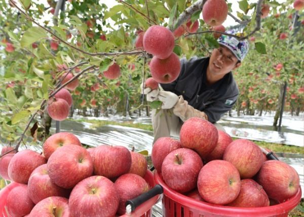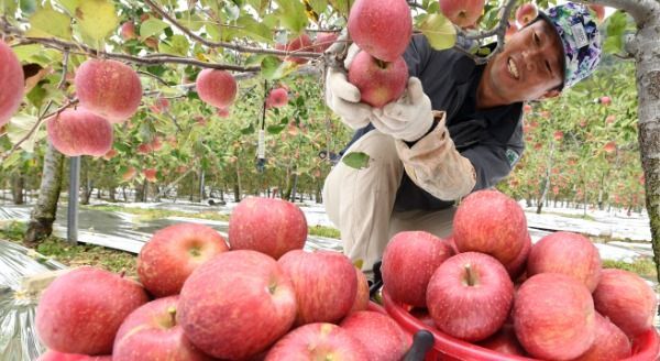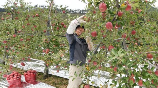 경남 거창군 북상면의 송계농원에서 귀농 3년째인 최병진(48세)씨가 부사 사과를 수확하고 있다.