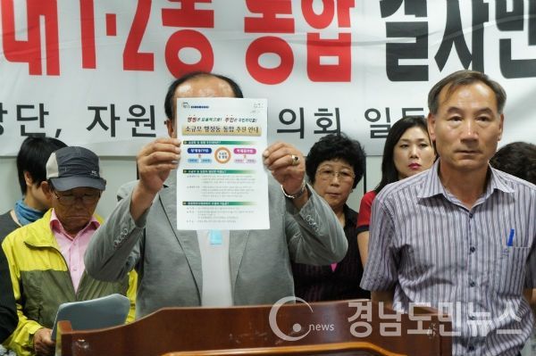 | 5월 30일에 진주시에서 통장들에게 배포한 하대1동과 하대2동 통합 홍보물을 '하대1동 통합반대 추진위원회' 대표가 들고 기자들에게 설명하고 있다.이 홍보물을 6월 3일에 받아본 통장도 있다고 전해 진주시 절차대로라면 시민들은 실제 통합 절차가 마무리된 이후 통합을 알게 될 수 밖에 없었을 것으로 보인다. |