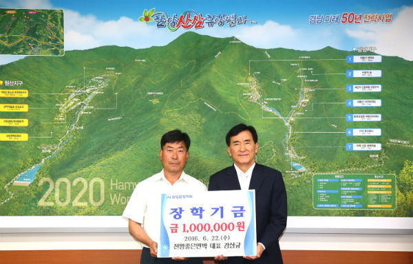 (함양/박현섭 기자) = ‘전망좋은 민박’(병곡면)대표 강상규씨가 함양인재양성과 고향발전을 기원하며 22일 (사)함양군장학회(회장 임창호군수)에 장학금 100만원을 기탁했다.