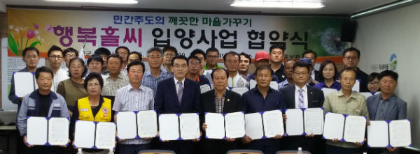 (거창/박현섭 기자) = 거창군(군수 양동인)은 지난 23일 가지리 지내마을 도랑살리기 홍보관에서 자연보호연맹 거창군협의회를 비롯하여 군내 민간단체와 기업체, 종교단체 등 33개 단체가 참여하여 깨끗한 마을가꾸기를 적극 주도하고 행복홀씨 입양사업 업무협력 협약을 체결했다.