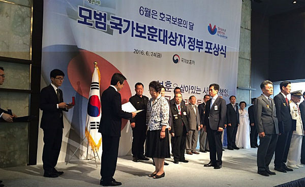 (함양/박현섭 기자) = 대한민국전몰군경미망인회 경남지부 함양군지회 황수연(83)지회장이 지난 24일 국무총리, 처장, 보훈단체관계자 등 100여명이 참석한 가운데 열린 정부포상전수 및 수여식에서 1984년부터 30여년간 지회를 이끌고 있는 황수연지회장이 국가사회발전공로로 대통령표창을 받았다.