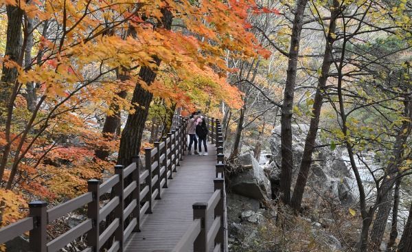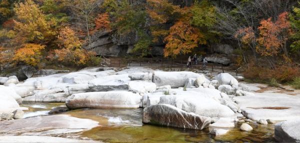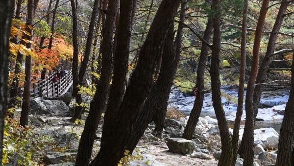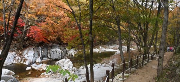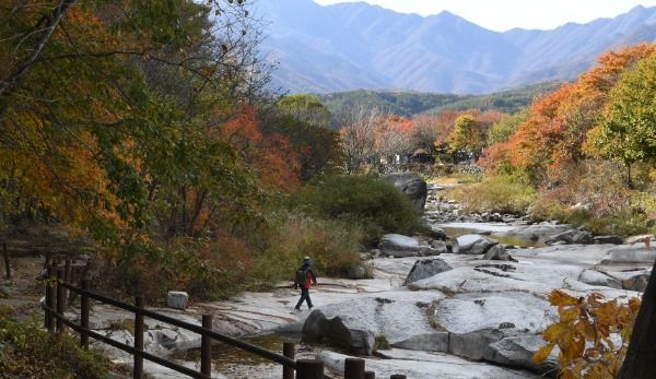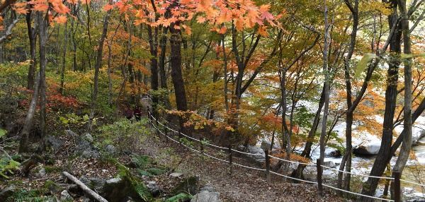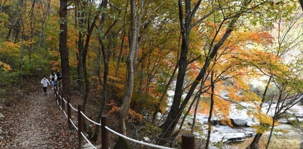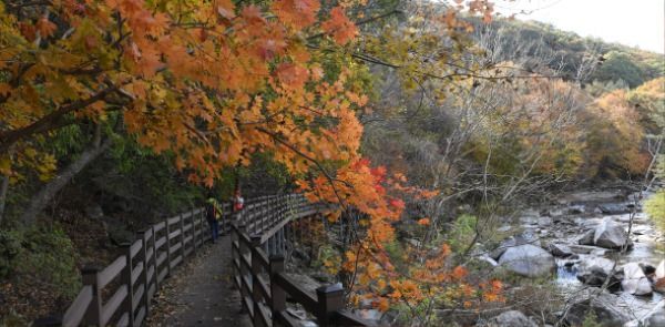 남덕유산 자락인 경남 거창군 북상면 월성계곡 ‘서출동류 물길 트레킹 코스’에 울긋불긋 단풍이 물들어 있다.