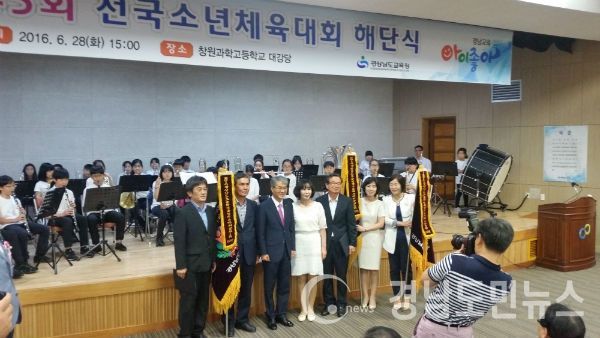 경상남도거창교육지원청(교육장 강신화)은 지난 28일 창원과학고등학교 대강당에서 실시한 제45회 전국소년체육대회 해단식에 참석하여 2016. 경남초·중학생종합체육대회 군부 종합 우승기를 들어 올렸다고 30일 밝혔다.