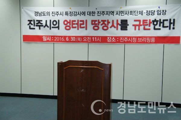 | 진주지역 12개 시민사회단체와 정당들이 이창희 진주시장의 엉터리 땅장사를 규탄하기 위해 진주시청 브리핑룸에 걸어둔 현수막. |
