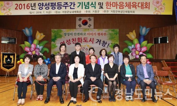 (거창/박현섭 기자) = 거창군(군수 양동인)에서는 거창군여성단체협의회(회장 정명조) 주관으로 2016년 양성평등주간을 맞아 거창군 실내체육관에서 양동인 군수를 비롯해 관내 기관단체장 및 여성단체회원 등 군민 800여명이 참석한 가운데 기념식 및 한마음 체육대회를 성황리에 개최했다고 1일 밝혔다.