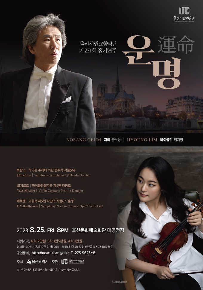 [경남도민뉴스] 울산시립교향악단이 오는 8월 25일(금) 오후 8시 울산문화예술회관 대공연장에서 제231회 정기연주회 ‘운명’을 연다.