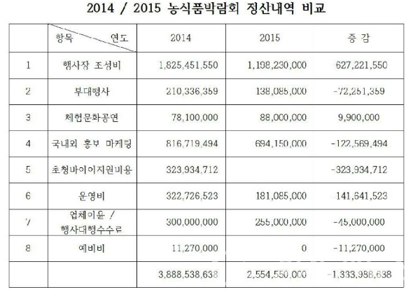 | 류재수 진주시의원이 공개한 2014년 2015년 진주국제농식품박람회 정산 비교 내역/ 행사장 조성비뿐아니라, 홍보비용과 바이어 지원비용, 대행수수료 등에도 면밀한 확인이 필요해 보인다. |