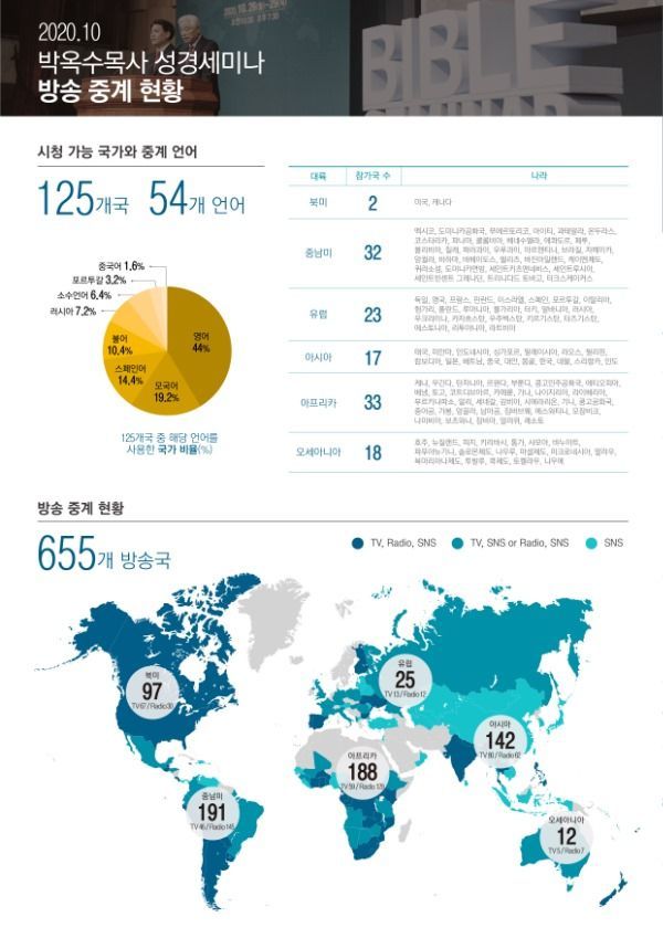코로나19로 고통 받고 있는 사람들을 위해 ‘OVERCOME(이기다, 극복하다)’을 주제로 개최된 이번 성경세미나는 유튜브 채널 ‘굿뉴스티비’와 ‘굿뉴스티비 글로벌’을 통해 생중계되고, 655개의 각국 TV와 라디오 방송사, 각종 SNS를 통해 전 세계 125개국에 전해지면서 ‘이동이 제한된 조건에서 공간의 제약을 극복하고, 예배와 선교의 영역을 온라인으로 확장시켰다’는 평가를 받고 있다.