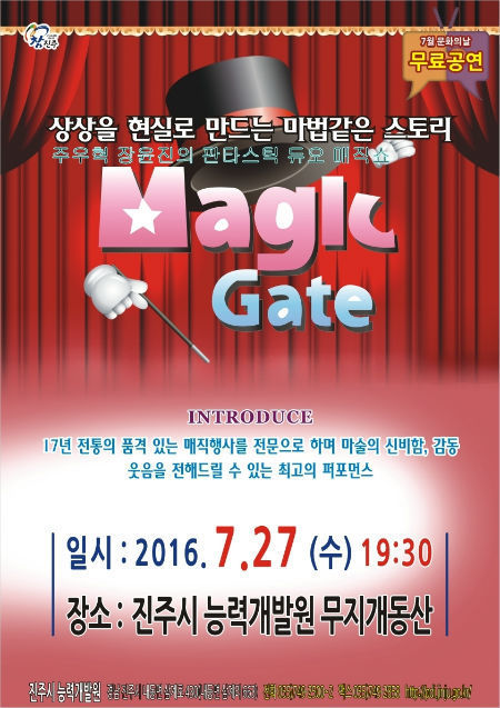 (진주/조권래 기자) = 진주시는 7월 문화가 있는 날을 맞아 주우혁 마술사의 매직쇼를 오는 27일 오후 7시 30분 능력개발원 3층 대강당에서 무료로 공연한다고 밝혔다.