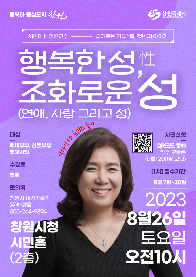 [경남도민뉴스] 창원특례시(시장 홍남표)는 26일 토요일 오전 10시 창원시청 2층 시민홀에서 배정원 박사를 초청하여 ‘슬기로운 커플생활 특강’을 개최한다고 밝혔다.
