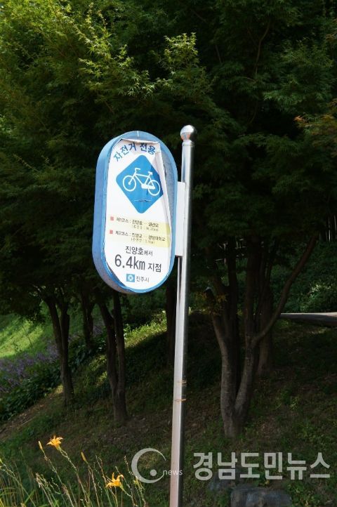 | 가림막용 대나무 울타리 설치구간에 진주시가 설치한 것으로 보이는 자전거도로 안내표지판이 색이파래고, 칠이 벚겨진채로 자리를 지키고 있는 모습 |