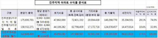 익명을 요구한 부동산 개발전문가는 “공동주택 사업의 수지분석은 크게는 수입과 지출로 나누어 진다”면서, “이미 센트럴웰가의 수입은 분양 등의 정보를 통해 충분히 확인할 수 있었기에 정보만 입력하면 산정할 수 있었고, 지출 역시 부동산을 개발 분야에서 수지를 분석해 본 사람이라면 어느정도 정확한 분석을 할 수 있었다”고 말하며 초장1지구 이지더원, 평거3지구 엘크루, 신진주역세권 센트럴웰가의 각 수지분석표를 제시했다.