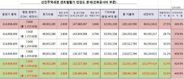 이에 단순하게 건축공사비(토목비포함) 변경만을 가정한 민감도분석결과 센트럴웰가측이 300만원에 공사를 해결할 경우 이미 1,000억원이 넘는 세전 순이익이 발생하는 것으로 계산됐다. 업체측이 300만원에 공사를 진행한다고 가정한다면 센트럴웰가측은 1,058억 1,481만원의 세전 순수익을 거둘 수 있고, 초기 투입비 대비 440.9%의 어마어마한 수익률을 기록하게 된다.