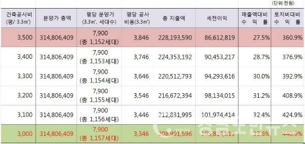 | 센트럴웰가 공동주택 시행단가에 따라 변동되는 수익률 분석(민감도분석표) |