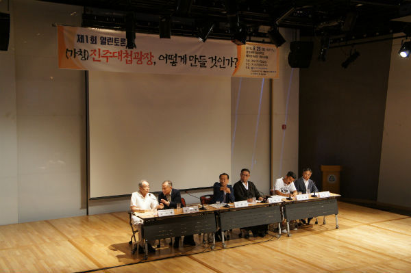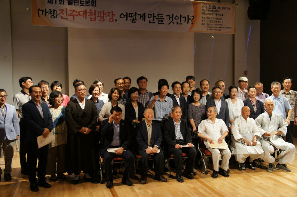 제1 발제자로 나선 (사)진주문화연구소 김수업 이사장은 "진주성을 지킨 계사순의의 선열을 제쳐두고 임진대첩만을 기념하는 광장은 옳지 않기 때문에 광장의 주제나 이름을 ‘진주대첩’이라 하는 것은 문제가 있다"고 꼬집고, "진주와 진주성의 역사를 오롯이 살리기 위해서는 가야시대 등 고대에서부터 형평운동과 농민항쟁을 담은 근대를 모두 아우를 수 있는 가치 담아야 할 것이다"고 의견을 제시했다.