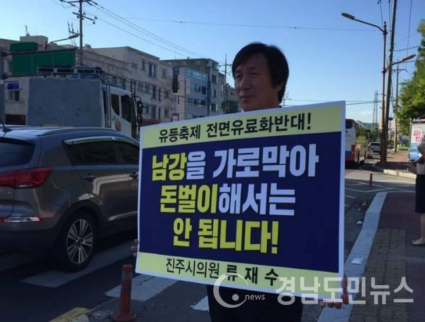 이에 대해 '남강을 가로막아 돈벌이 해서는 안됩니다'는 피켓을 들고 남강유등축제 전면유료화 반대 1인시위를 벌이고 있는 류재수 진주시의원(무소속, 다 선거구)은 "조그만 매표소 설치가 문화재청에 문화재 현상변경허가를 받아야 하는 시설물이라면, 진주의 자랑인 아름다운 남강과 촉석루를 축제기간동안 가림막을 설치해 가리는 것도 문화재 경관을 훼손한 것이다"고 꼬집어 말했다.