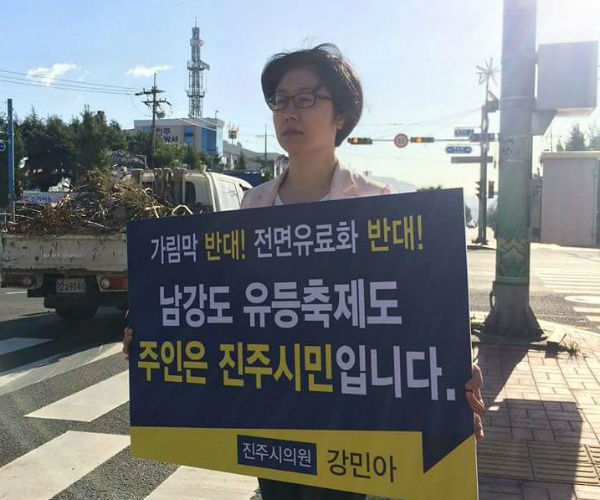 | 진주시의회 강민아의원(무소속, 바 선거구)이 '남강도 유등축제도 주인은 진주시민입니다.'는 내용의 피켓을 들고 가림막반대, 전면유료화 반대 1인시위를 하고 있는 모습/ 사진출처=강민아의원 SNS페이지 |