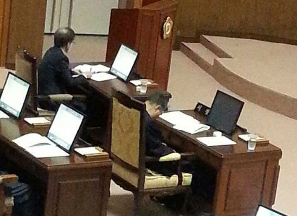 | 이창희 진주시장이 2016년 6월 21일 있었던 제186회 진주시의회 제1차 정례회 본 회의에서 조는 듯한 모습. 이때 진주시의회는 2015년 예산결산 심사를 승인하기 위해 소집된 회기였다. |
