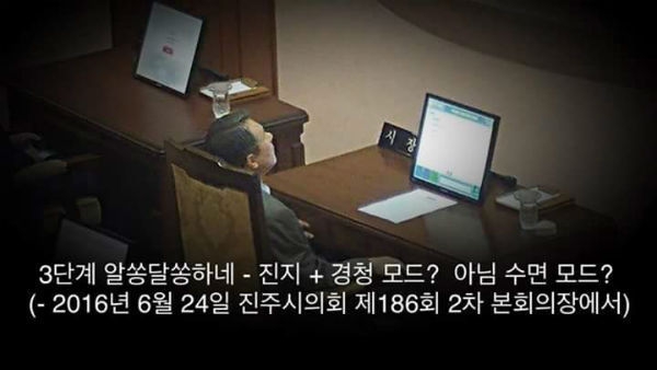 | 단디뉴스 에서 2016년 6월 21일 이창희 진주시장이 자는 듯한 모습을 포착해 단신으로 보도한 사진/사진출처= 단디뉴스SNS 홈페이지 |