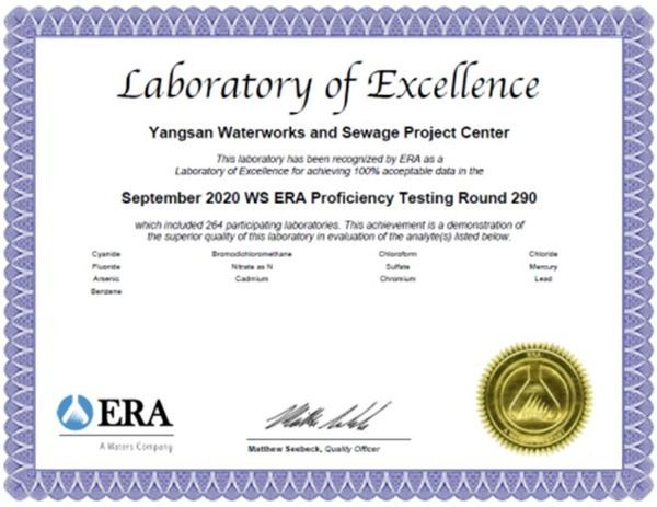 [경남도민뉴스] 양산시 상하수도사업소 『먹는물 수질검사기관』은 지난 10월 국제공인시험기관 미국 환경자원협회 ERA와 독일 MERK에서 주관하는 먹는물 분야 국제숙련도 시험에 참가하여 국제공인 인증서를 획득했다고 밝혔다.