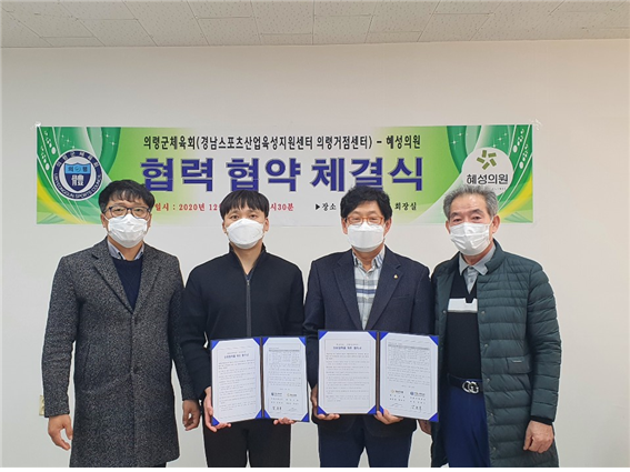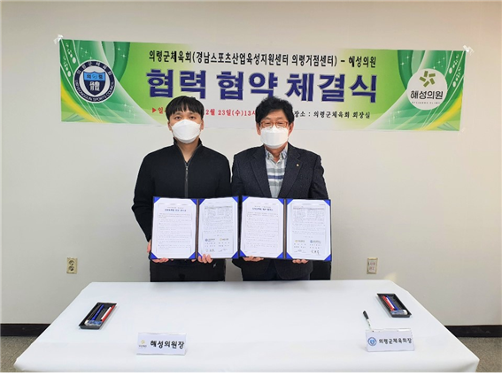 [경남도민뉴스] 의령군체육회(회장 강원덕)는 지난 23일(수) 의령병원(이사장 이미경), 혜성의원(원장 곽명수)와 경남스포츠산업육성지원센터 의령거점센터의 원활한 사업을 추진하기 위해 업무협약(MOU)을 체결하였다.