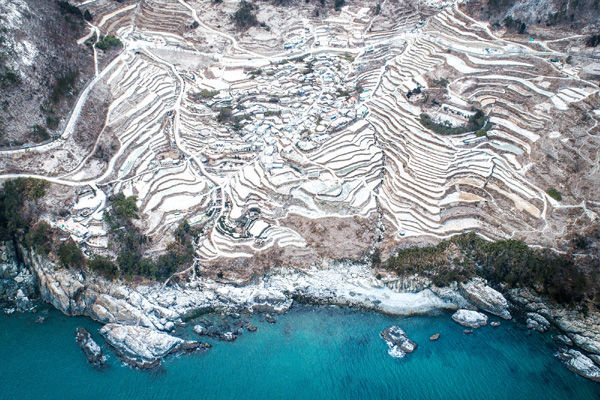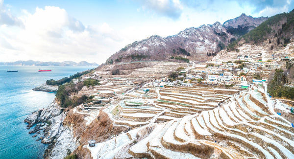 7일 오전 남해군 가천 다랭이마을에 층층이 눈이 쌓였다. ‘눈’이 드문 남해에 모처럼 설경이 펼쳐져 장관을 이루고 있다.