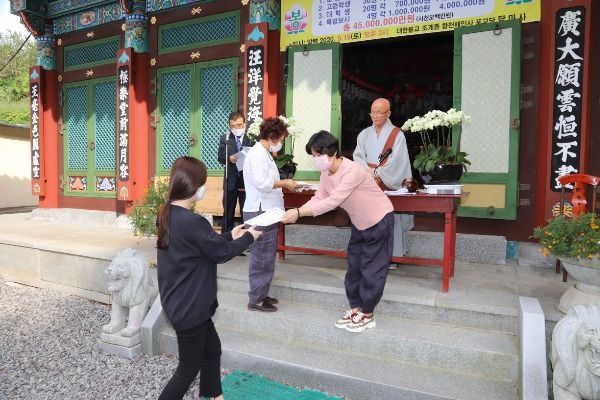 사진설명 = 지난해 9월 달마사 해일스님이 지역학생과 어려운 이웃들에게 성금을 전달하고 있다.