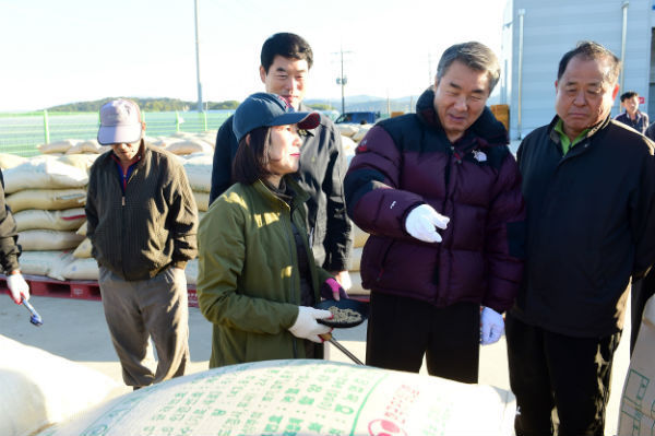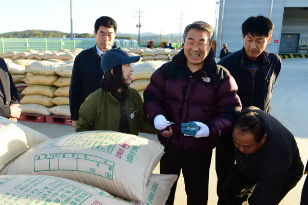 | 이창희 진주시장이 쌀값 폭락에 풀죽은 농부를 뒤로 하고 농협 RPC 수매장에서 환하게 웃고 있는 모습/ 사진출처=진주시 |