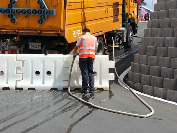 | 진주시관계자들이 남강레일바이크 주차시설 폐쇄 시설물인 PE드럼형 시설에 물을 채우고 있는 모습 2015년 8월 일/ 사진제공=남강레져산업 |