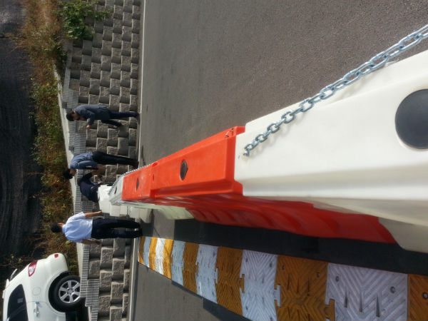| 진주시관계자들이 남강레일바이크 주차시설 폐쇄 시설물인 PE드럼형 폐쇄시설에 쇠사슬을 설치하고 있는 모습 2015년 10월(국민권익위원회 진정서 제출 후 1개월여 시점) / 사진제공=남강레져산업 |