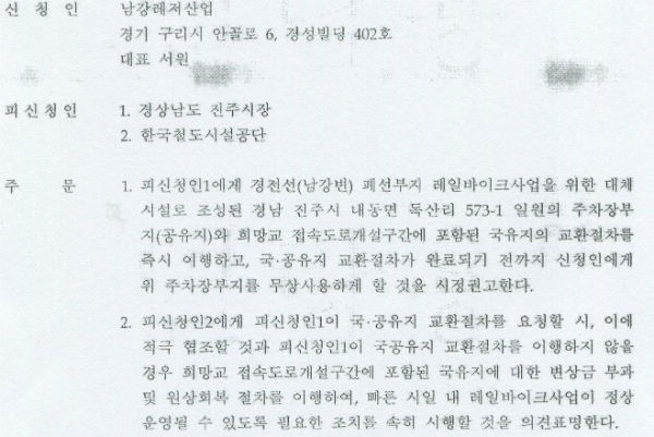 | 국민권익위원회가 남강레일바이크 사업에 대해 의결한 의결문중 주문/ 자료출처=남강레져산업 |