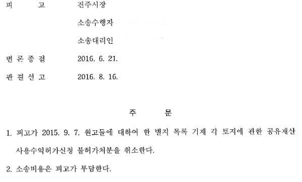 | 진주시가 처분한 남강레일바이크 주차시설 공유재산사용 수익허가 불허처분에 대한 취소를 요구한 창원지방법원의 판결문중 주문/ 자료출처=남강레져산업 |