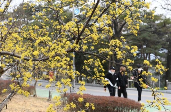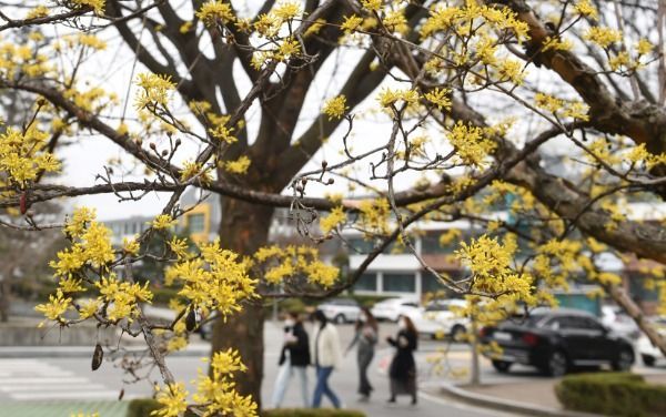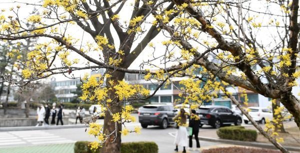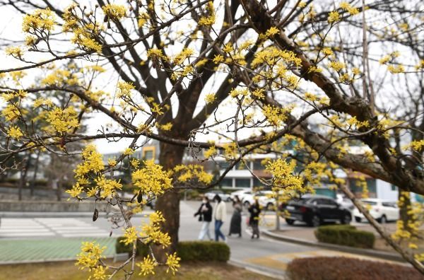 경칩을 하루 앞둔 4일경남 거창군 거창읍 경남도립거창대학 캠퍼스에 봄의 전령 노란 산수유꽃이 활짝 피어 있다.