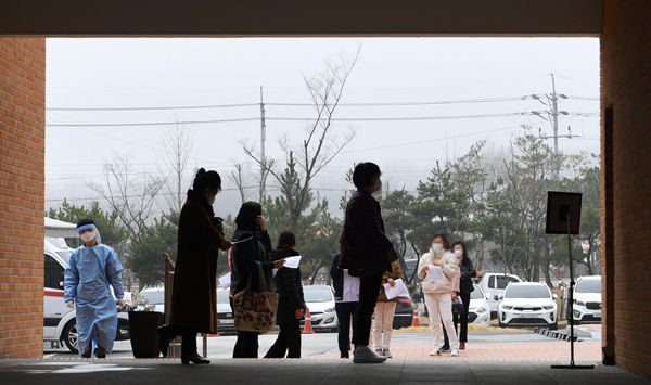 신종 코로나바이러스 감염증(코로나19) 백신접종 7일째인 5일 오전 경남 거창군 거창읍 거창보건소에서 요양시설 종사자들이 백신접종을 위해 대기하고 있다.