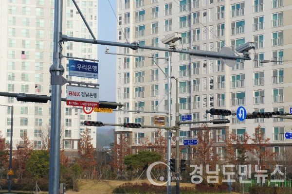 | 진주혁신도시 주간선도로인 동진로 교차로 신호등에 대형은행 등이 설치한 불법광고물 모습/사진=조권래 |
