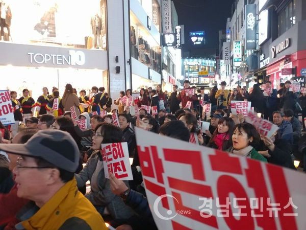 진주시민이 하나 되어 외친다. 대한민국 헌정질서를 짓밟고 국정을 마음대로 농락한 박근혜는 모든 권한을 내려놓고 법의 심판을 받아라!